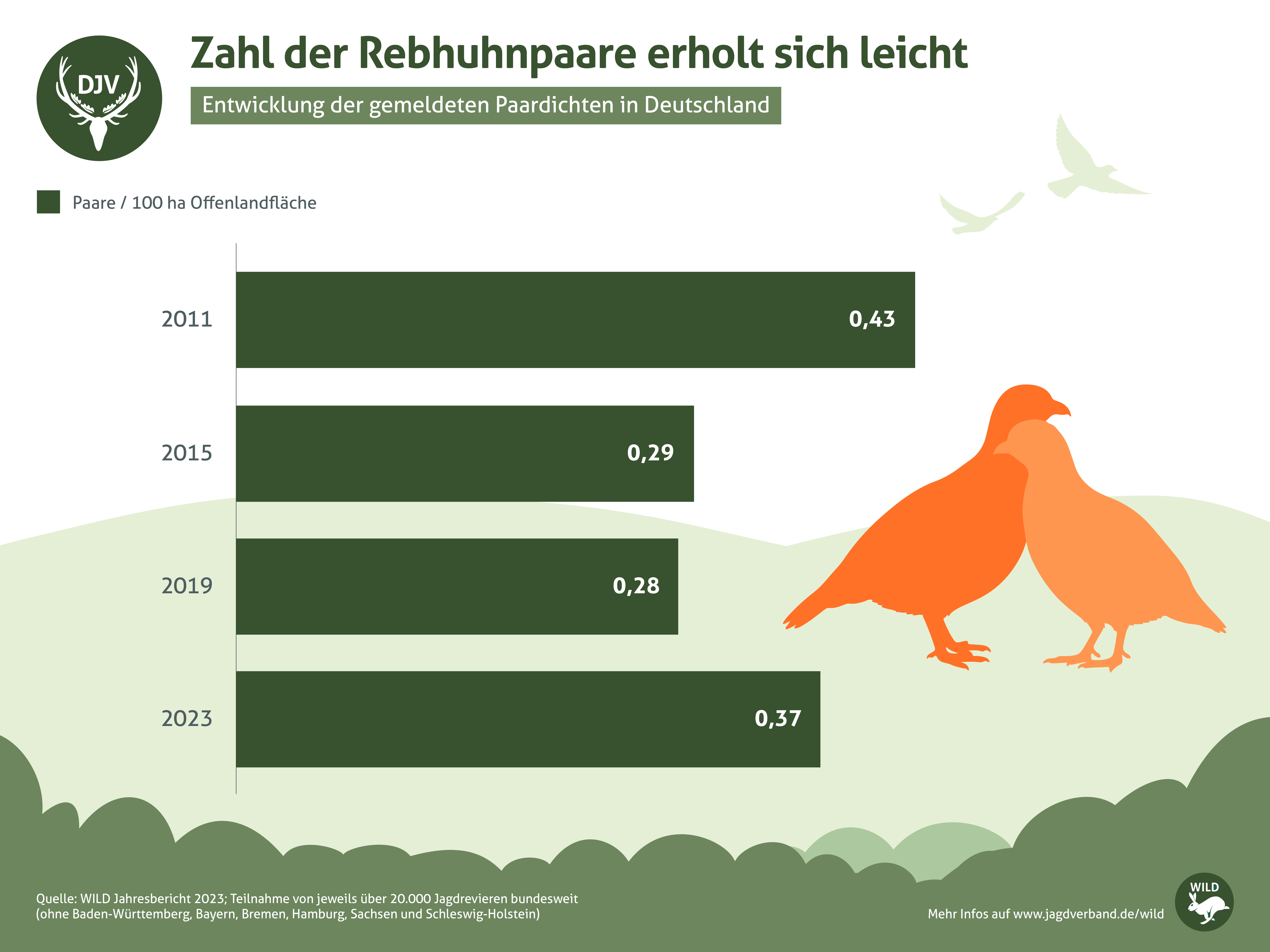 Die meisten Rebhühner leben in Hessen. Dort haben Jägerinnen und Jäger für das Frühjahr 2023 pro Quadratkilometer 0,68 Vogelpaare gemeldet. Knapp dahinter liegt Nordrhein-Westfalen mit 0,66 Paaren. Auf Platz 3 folgt Rheinland-Pfalz mit 0,44 Paaren. Daten aus Bayern lagen nicht vor.